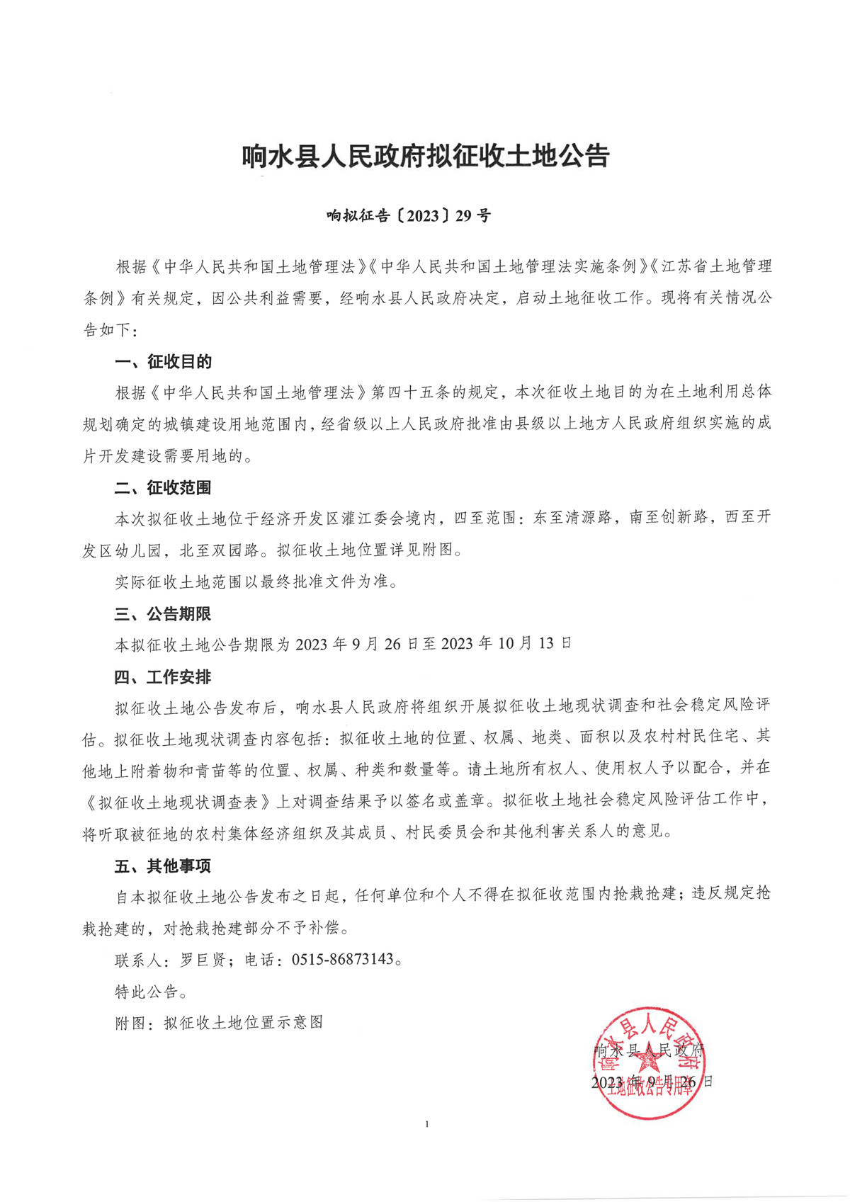 响水县人民政府拟征收土地公告 响拟征告〔2023〕29号