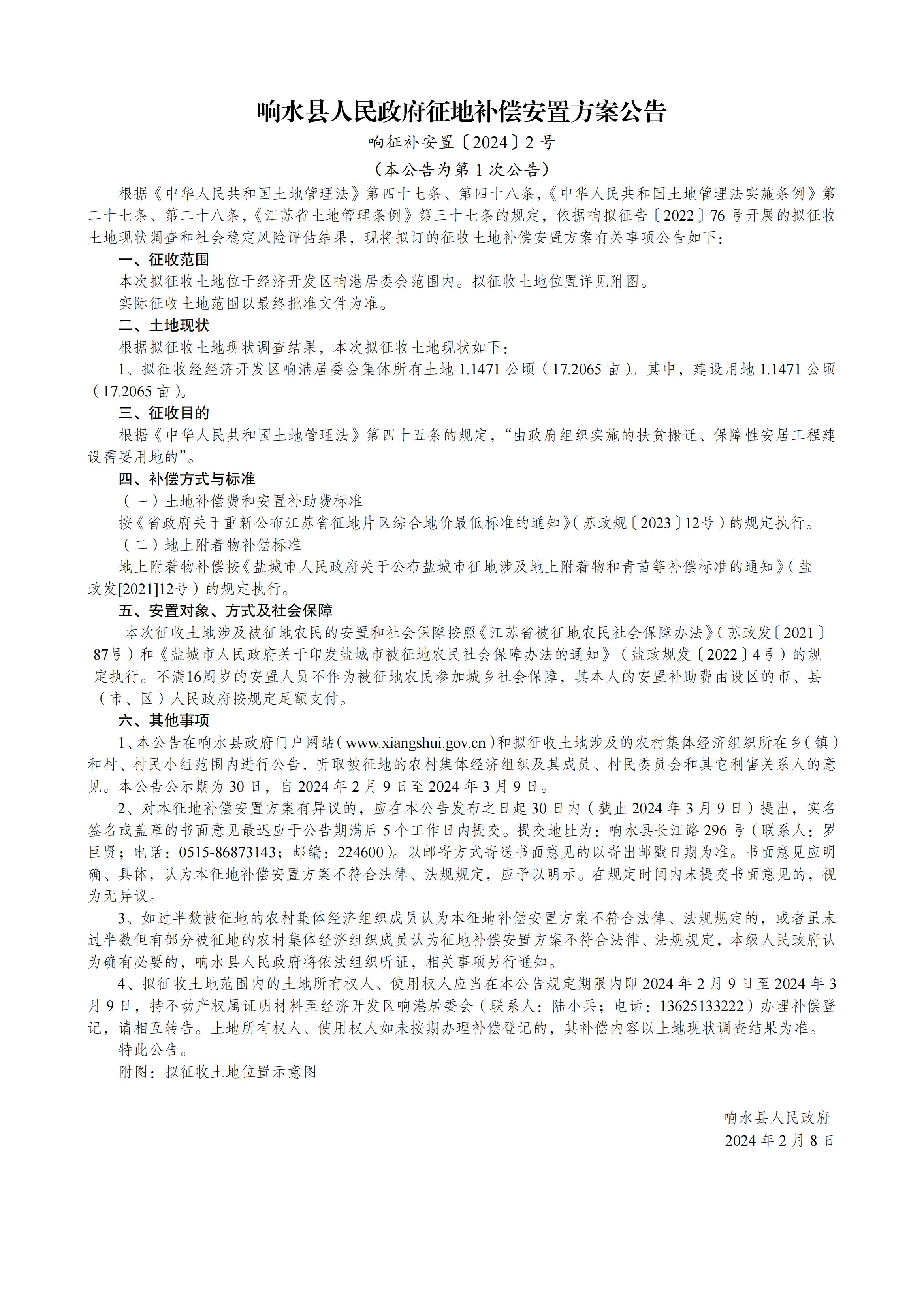 响水县人民政府征地补偿安置方案公告响征补安置〔2024〕2号