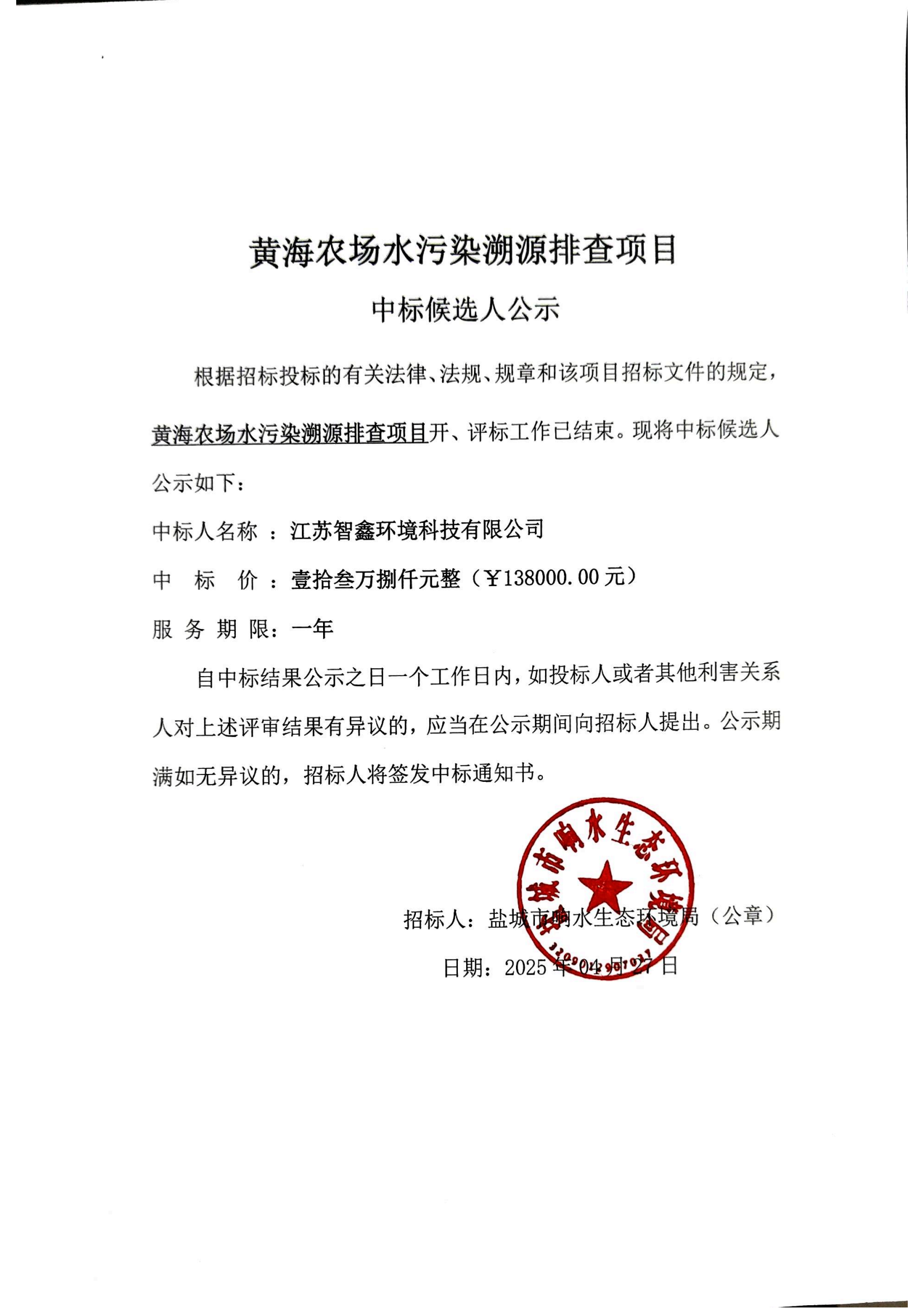 黄海农场水污染溯源排查项目中标候选人公示