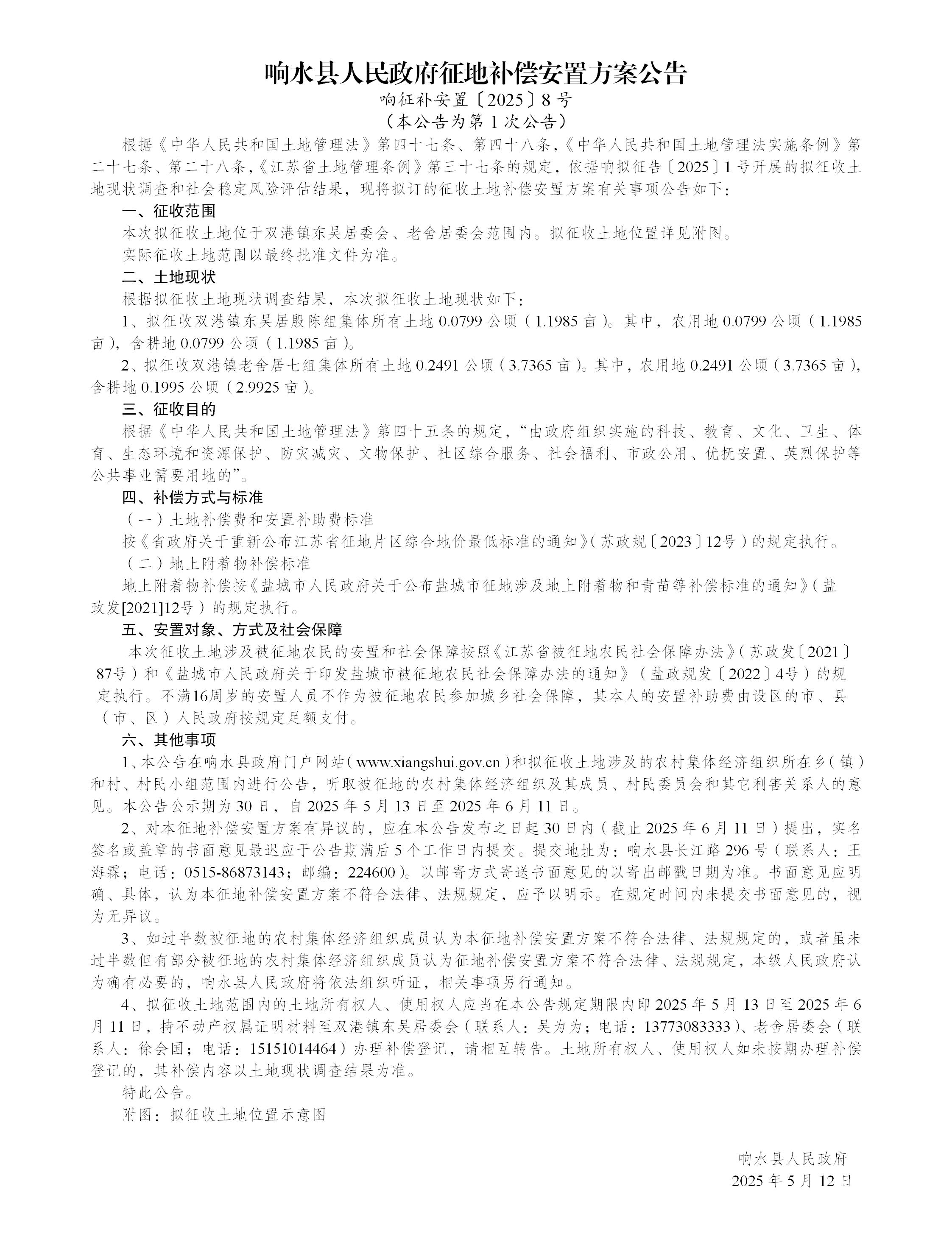 响水县人民政府征地补偿安置方案公告响征补安置〔2025〕8号