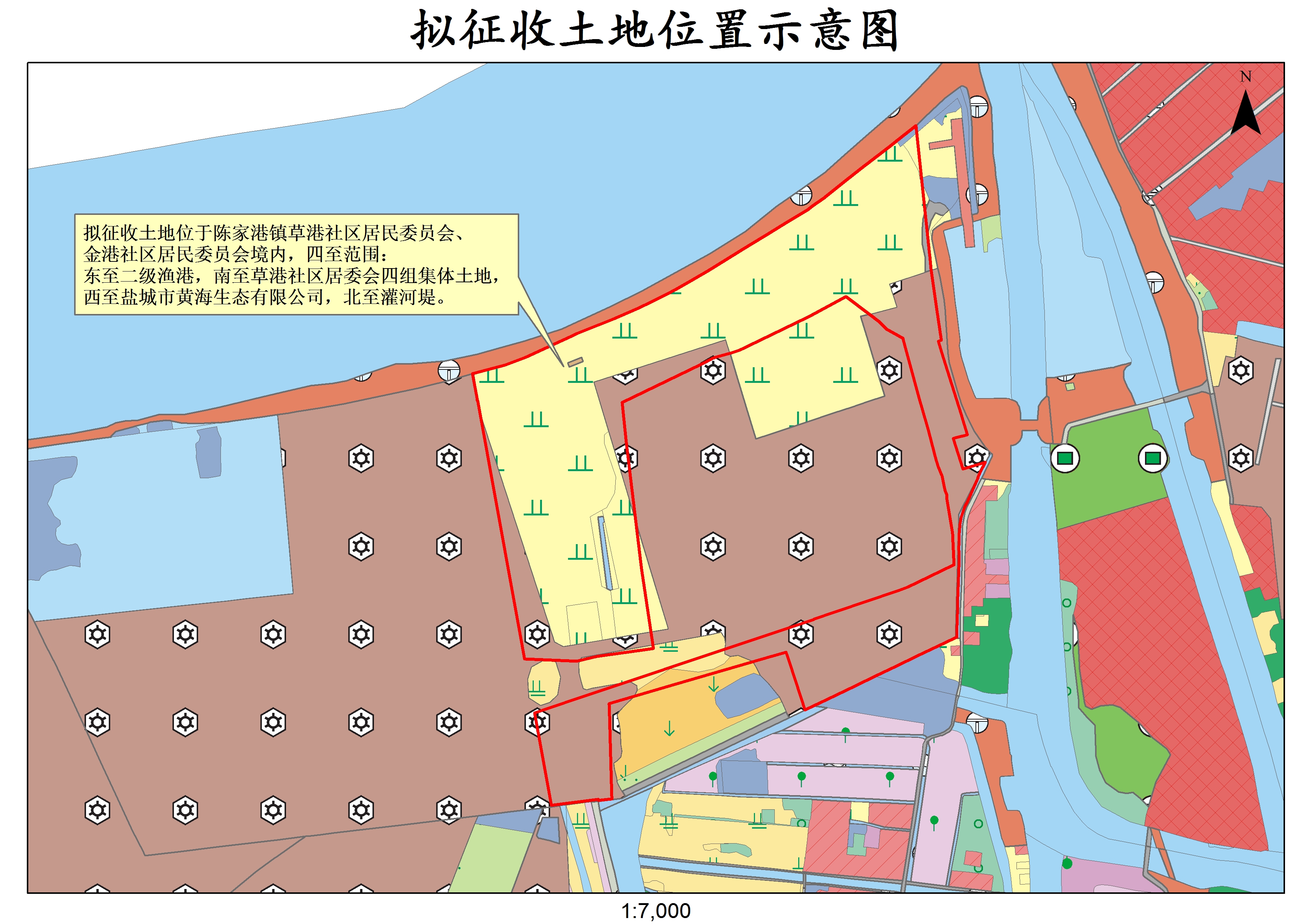 本次拟征收土地位于陈家港镇草港社区居民委员会、金港社区居民委员会境内,四至范围:东至二级渔港,南至草港社区居委会四组集体土地,西至盐城市黄海生态有限公司,北至灌河堤。